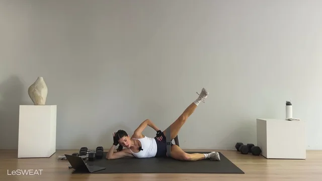 Haremos ejercicios como: Desplante + booty kick, peso muerto a una pierna, puentes, clams, elevaciones laterales y más.